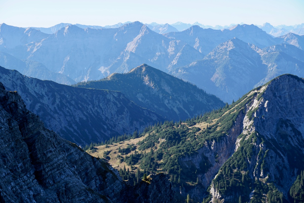 Nachdem in letzter Zeit das Auto meist eher voll war, musste/wollte ich diesmal alleine los. Alleine sind Berge wie der Kreuzspitze schon ein wenig schaurig. Im Hochkargrieß kann man sich alleine fast verloren fühlen. Die Schotterwüste erscheint schier endlos, die dahinterliegenden Felswände bedrohlich. Ich bin jedenfalls fast schon froh, dass ich an diesem Samstag Morgen nicht der Einzige bin, der sich hier hinaufquält. Als ich um kurz nach Acht Uhr am Parkplatz losgelaufen bin, standen dort schon mindestens zehn Autos, und so sind immer ein paar Wanderer im Blick – oder wahlweise im Nacken. Das hilft dann auch, um dem eindrucksvollen Gipfelaufbau den Schrecken zu nehmen. Wo geht denn da der Weg? Ach da wo die roten Punkte sind. Schnitzeljagd mit Kraxeleien. Das klingt jetzt alles nicht so schön. Das war’s aber. Schaurig schön halt.